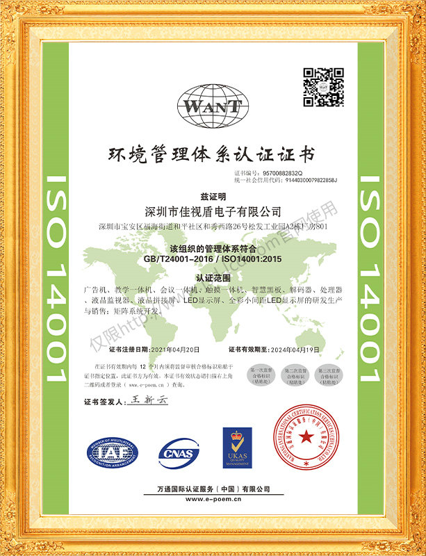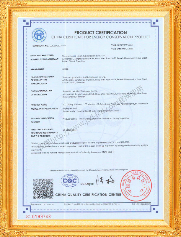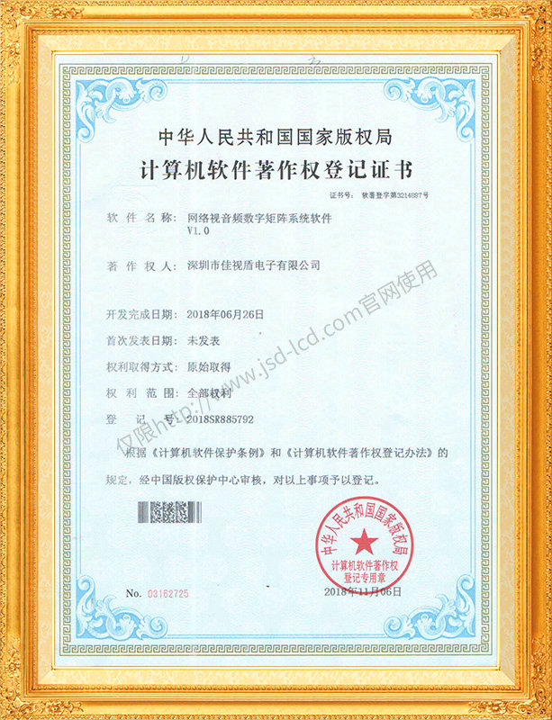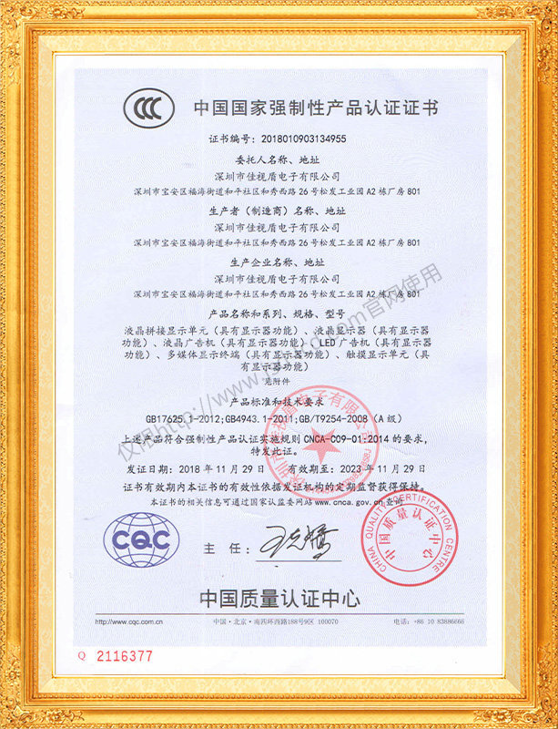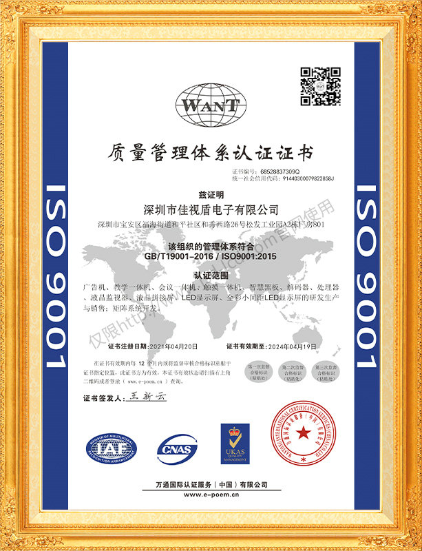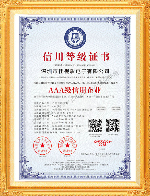 佳視盾科技采用了科學(xué)現(xiàn)代化管理模式,公司和產(chǎn)品通過了CCC、CB、CE、FCC、ROHS、ISO9001、職業(yè)健康管理體系、環(huán)境管理體系,中國節(jié)能認(rèn)證、多項(xiàng)認(rèn)證,取得多項(xiàng)專利技術(shù)及多項(xiàng)軟件著作權(quán), 并獲得國家及行業(yè)協(xié)會的多項(xiàng)榮譽(yù)證書,所有產(chǎn)品均經(jīng)過嚴(yán)格老化檢測及測試,達(dá)到行業(yè)優(yōu)等品的出貨標(biāo)準(zhǔn)。